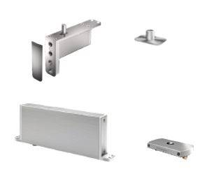 Ensemble pivots de porte complet "Système M" STM+40-AA, offrant 1 fonction ferme porte avec freinage à l'ouverture et blocage à 90° et -90°. Gâches rectangulaires au sol et au plafond.