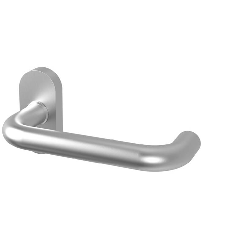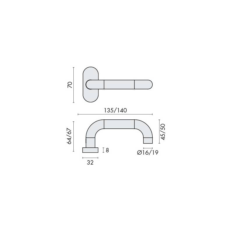 Paire de béquilles sur rosaces ovales carré de 8*8 mm, modèle U16 mm "Project 03". Rosaces épaisseur 10 mm intégrant un ressort de rappel et 2 fixations entraxe 50 mm. Finition inox brossé AISI 304.