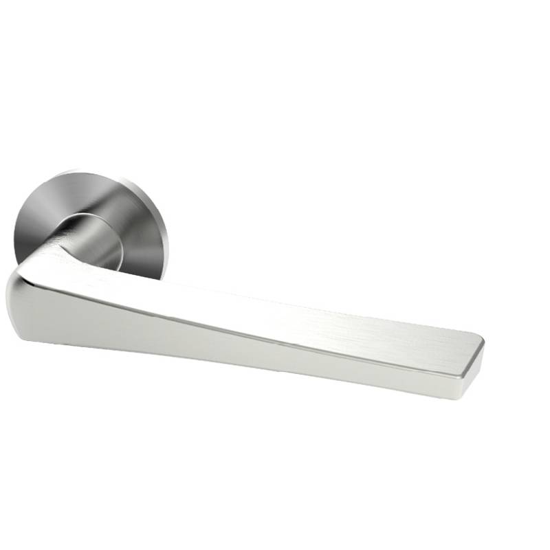 Paire de béquilles sur rosaces rondes à visser, "Project 10". Ressort de rappel + douilles pour vis traversantes pré-montées et sous construction acier inoxydable. Finition inox brossé AISI 304 et conforme à la norme EN1906 grade 4.