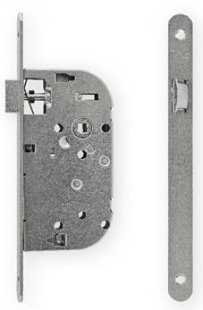 Coffre de serrure bec de cane, axe à 50 mm, NF, pêne réversible, têtière aspect inox, bouts ronds, entraxe 70, gâche en sus.