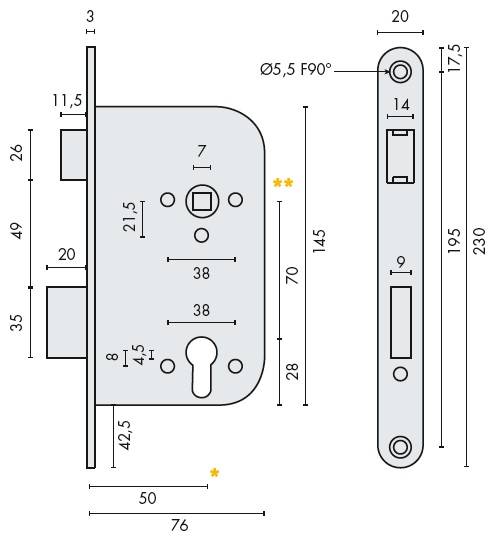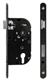 Coffre de serrure cylindre européen (clé I), axe à 50 mm, NF, pêne réversible, têtière noire, bouts ronds, entraxe 70, gâche en sus.