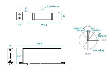 Ensemble pivots de porte complet "Système M" STM70/B, offrant 1 fonction ferme porte avec freinage à l'ouverture et blocage à 90° et -90°. Gâches rectangulaires au sol et au plafond.