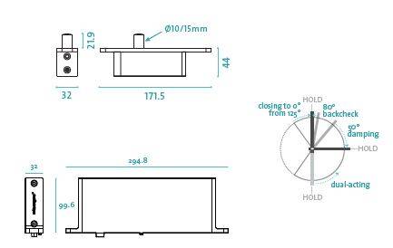 Ensemble pivots de porte complet "Système M" STM70-C/TP70, offrant 1 fonction ferme porte avec freinage à l'ouverture et blocage à 90° et -90°. Gâches rectangulaires au sol et au plafond.