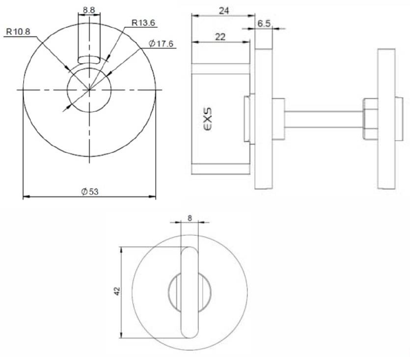 Ensemble condamnation - décondamnation avec voyant série "Project". Inox brossé AISI 304, diamètre 53 mm, épaisseur 6,5 mm et carré de 6*6 mm.