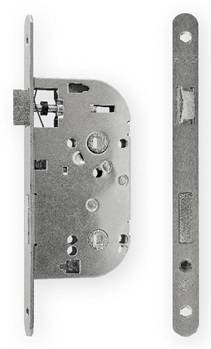 Coffre de serrure bec de cane à condamnation, axe à 50 mm, NF, pêne acier réversible, têtière inox, bouts ronds, entraxe 70, gâche en sus.